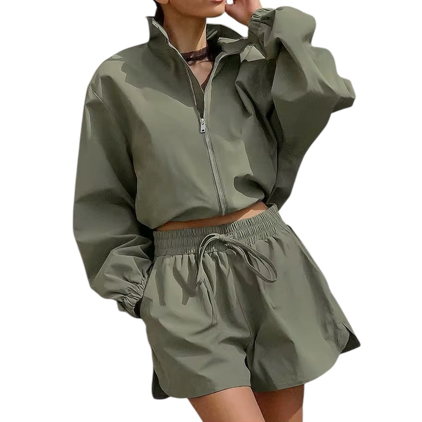 Experience effortless elegance this autumn with our casual sports jacket and short set. The jacket features a sleek design ideal for layering, while the elastic shorts offer comfort and flexibility. This combination provides a polished yet relaxed look, perfect for stylish, everyday wear during the cooler seasons.